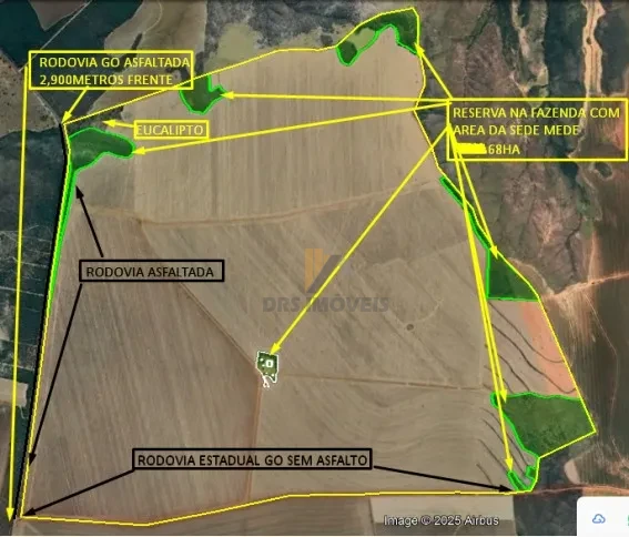 Fazenda com 1.106 ha sendo 1.039 ha em plantio. Reserva e sede com área de 68 ha, restante da reserva fica fora da propriedade. Contém 1 barracão de 1.350,00m² e 02 casas de 130,00m² cada uma. Fica na região de Formoso - GO, à 170 km de Brasília, estrada asfaltada. Completa em água e eletricidade.